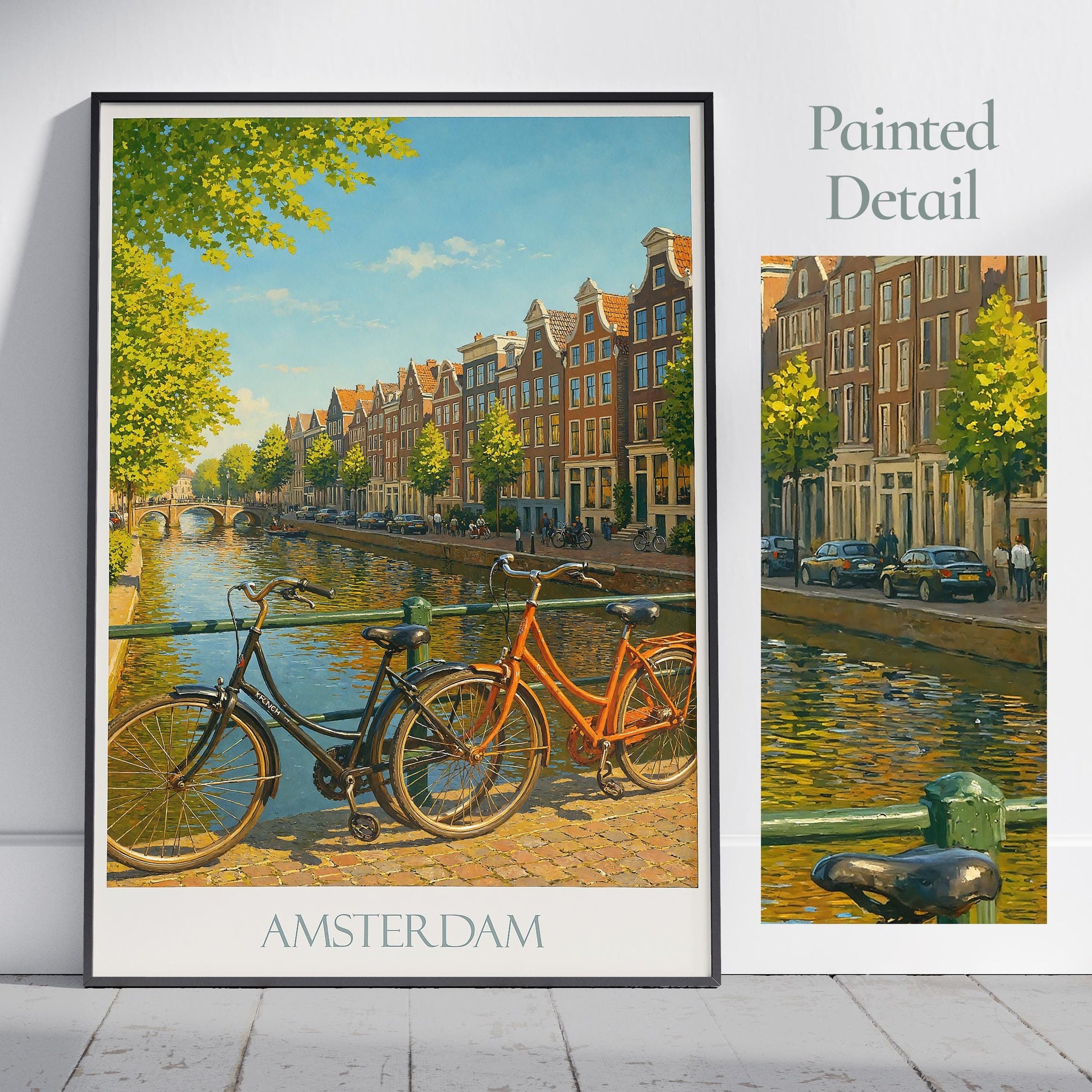 Keywords: Amsterdam bicycle print, Netherlands cycling art, Dutch travel poster, canal and bike scene, Amsterdam street photography art, Europe bicycle wall art