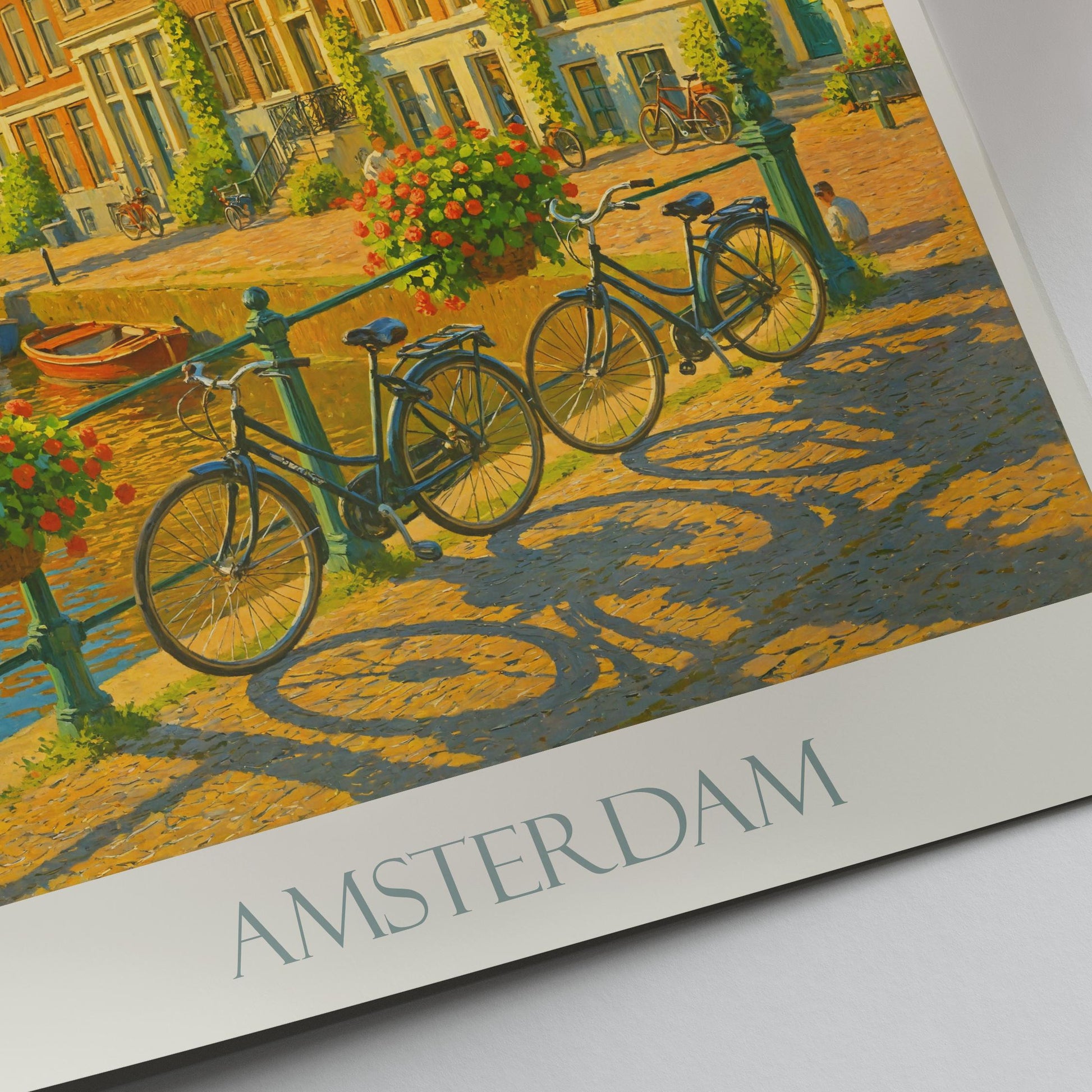Keywords: Amsterdam bicycle print, Netherlands cycling art, Dutch travel poster, canal and bike scene, Amsterdam street photography art, Europe bicycle wall art