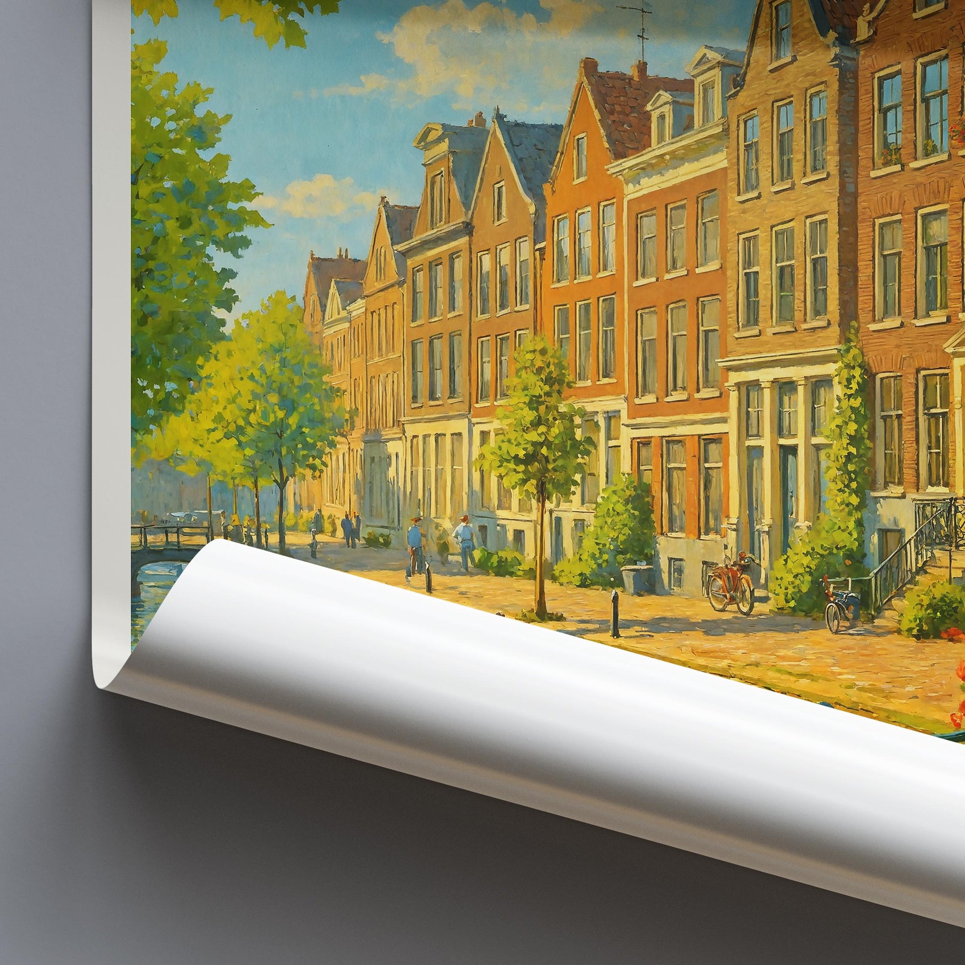 Sun-dappled facades and flower-lined streets define this cheerful Amsterdam poster. Gabled houses overlook a peaceful canal, with bicycles lined up in the foreground and boats drifting past. A vivid snapshot of daily life in the Netherlands, perfect for a hallway or home office.