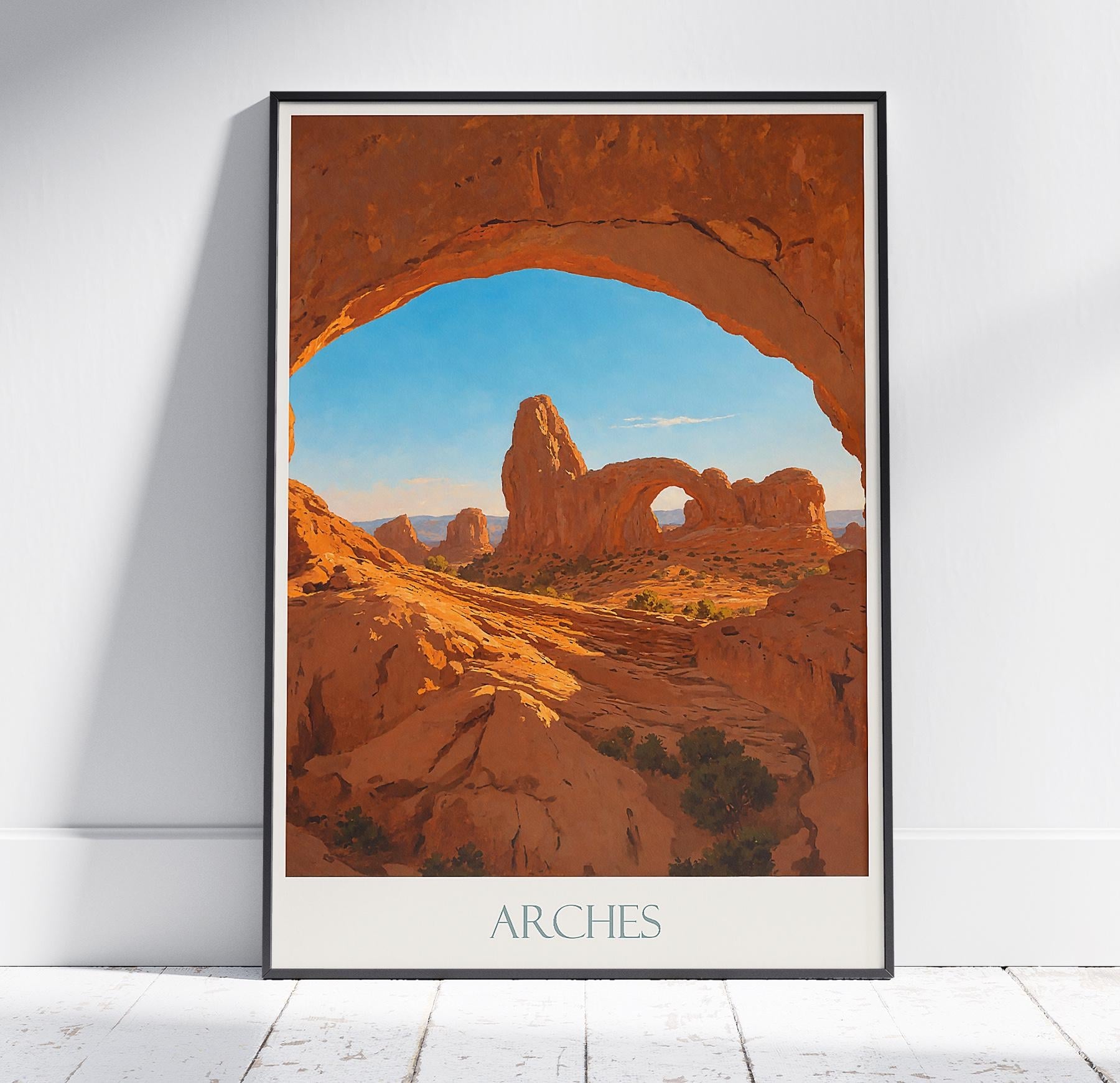 Transport yourself to the breathtaking desert landscape of Arches National Park with this stunning print featuring the iconic North Window arch. The artwork captures the dramatic framing of Utah's distinctive red rock formations as seen through one of the park's most famous natural stone arches. The vivid contrast between the warm sandstone colors and the deep blue sky showcases the otherworldly beauty of this American Southwest treasure. Perfect for desert lovers, hikers, and anyone who appreciates the unique geological wonders of Utah's red rock country and America's spectacular national parks.