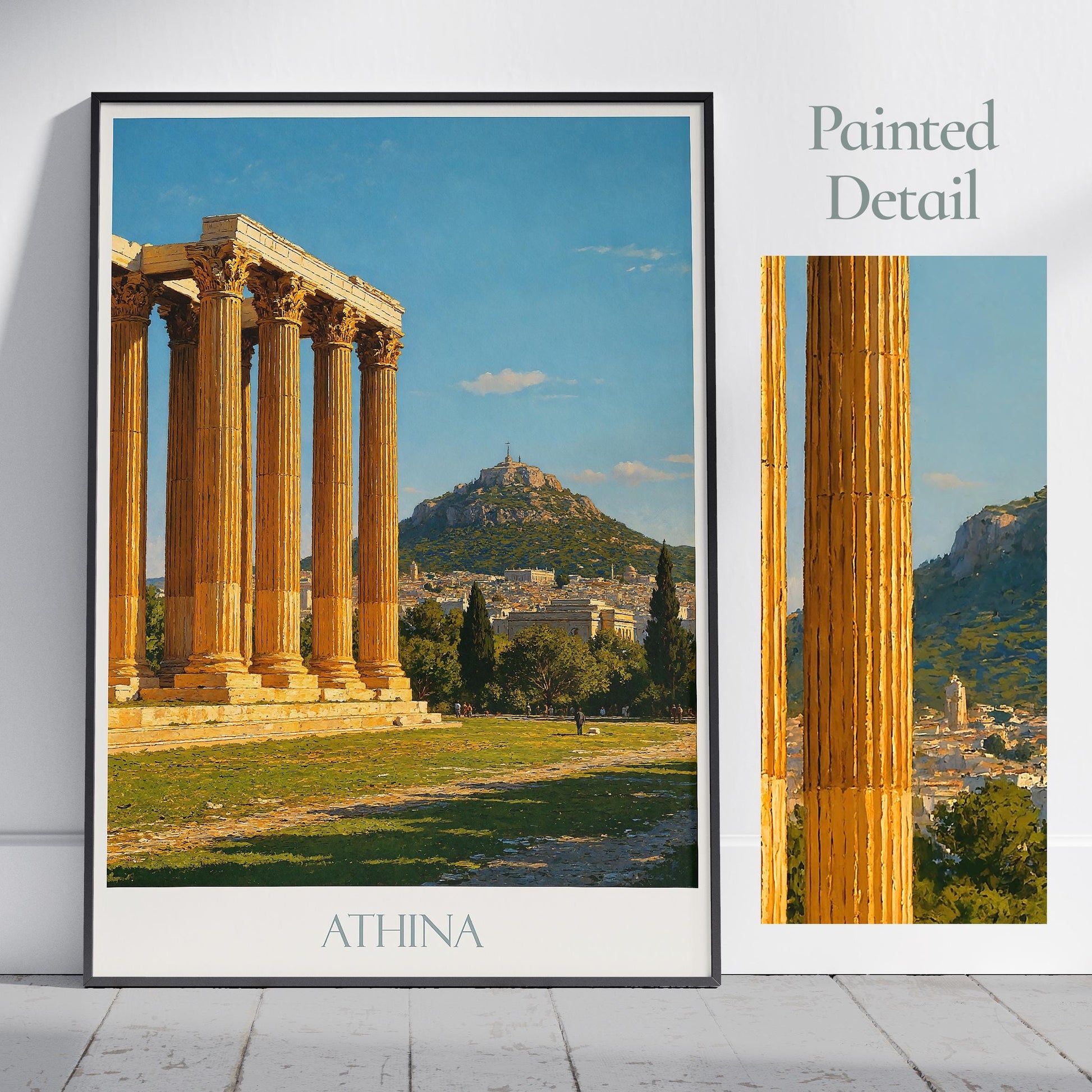 Celebrate the legacy of Ancient Greece with this dramatic view of the Temple of Olympian Zeus in Athens (Athína), its Corinthian columns glowing in the sunlight. Behind, Mount Lycabettus rises in the distance, tying together myth and skyline in one striking print.