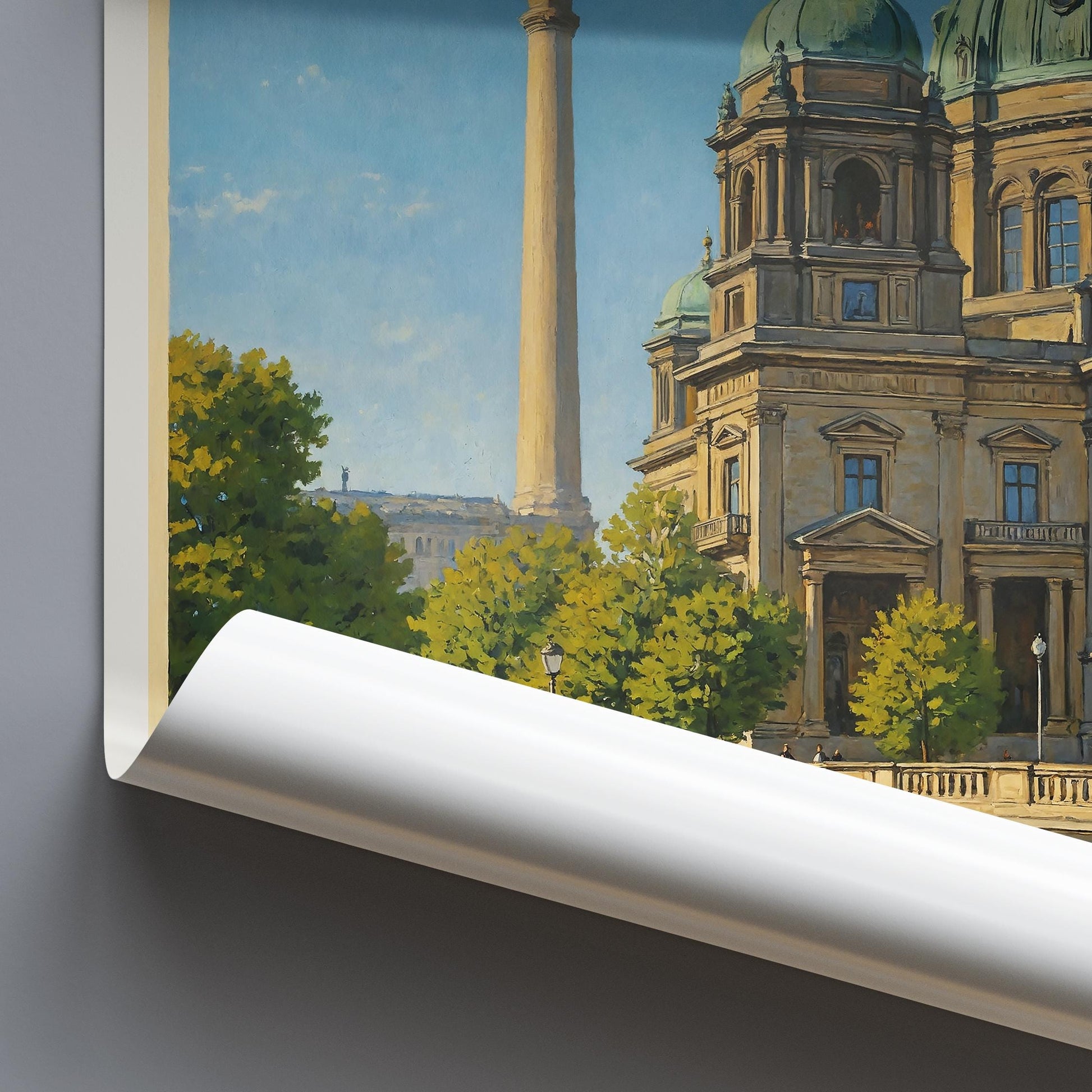 This crisp Berlin view centers on the magnificent dome of the Berliner Dom, rising from the banks of the Spree with the Fernsehturm behind. The bridge and water reflections anchor the scene with architectural grace.