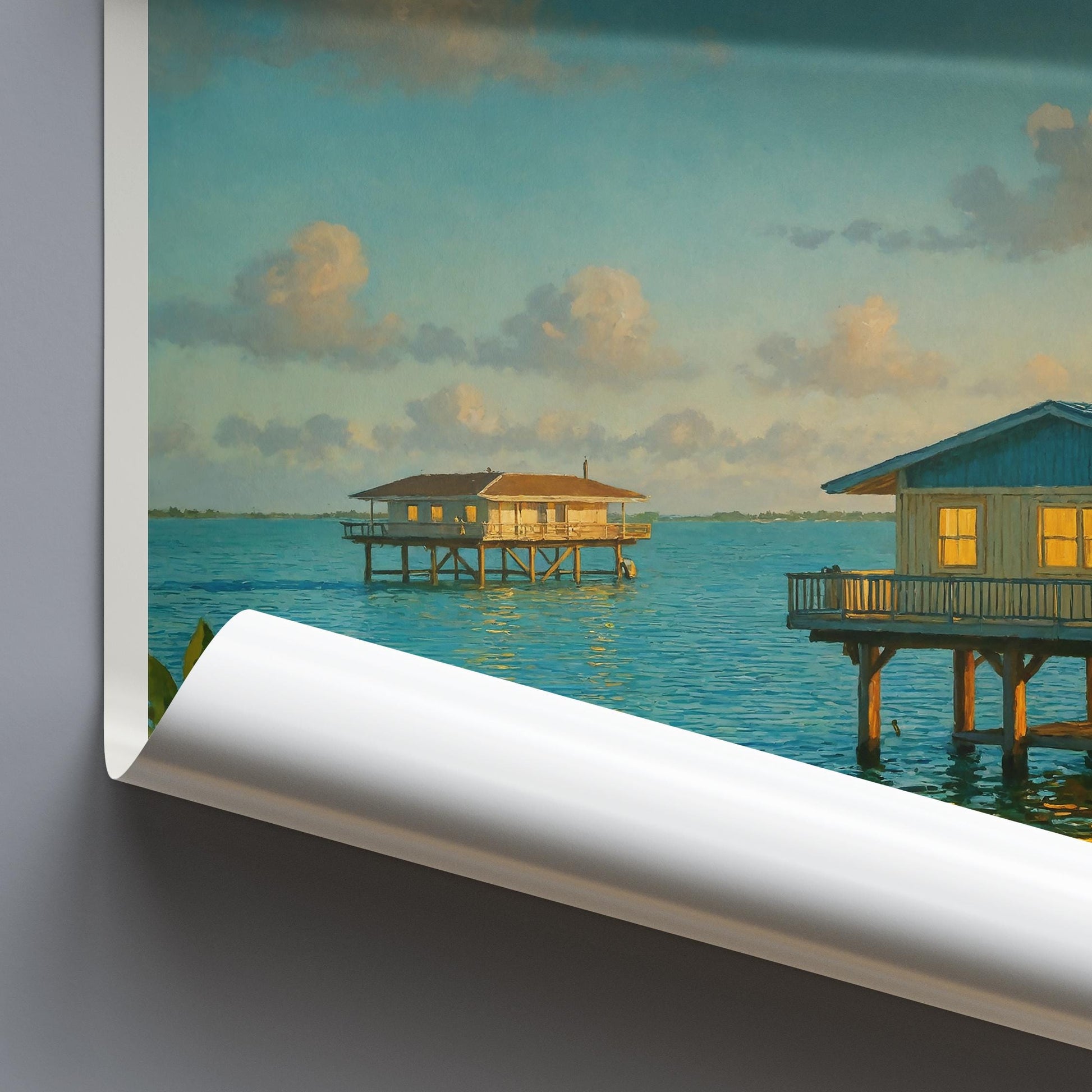 Transport yourself to the turquoise waters of Biscayne National Park with this stunning art print featuring iconic stilt houses. This Florida coastal artwork captures the serene beauty of Stiltsville, the historic overwater structures that have become symbols of Miami's maritime heritage. The warm golden light bathes the wooden homes as they float above crystal-clear waters, perfectly depicting South Florida's unique coastal charm. Ideal for beach house décor, Florida vacation memories, or anyone who appreciates the tranquil beauty of Biscayne Bay where the Atlantic Ocean meets the Florida Keys. This Miami maritime print makes a perfect gift for coastal lovers and Florida natives alike.