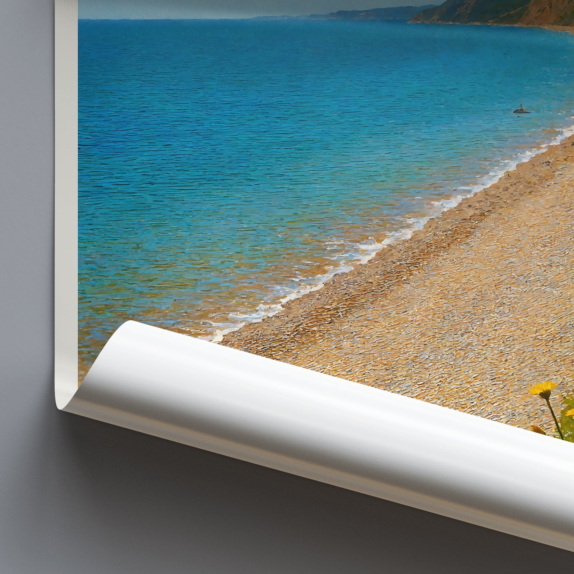 BRANSCOMBE BEACH (Devon, England) - Experience the serene beauty of the Jurassic Coast with this stunning Branscombe Beach travel poster. This captivating art print showcases the picturesque pebble beach, framed by dramatic green cliffs and vibrant wildflowers in the foreground, including cheerful red poppies and yellow blooms. The azure waters of the English Channel gently lap the shore, inviting a sense of calm and escape. Perfect for coastal home decor, a thoughtful gift for beach lovers, or as a cherished souvenir of a Devon vacation, this print brings the idyllic charm of England's South West directly into your home. Its artistic, painterly style adds a unique touch, capturing the essence of a perfect summer's day on the British coast.