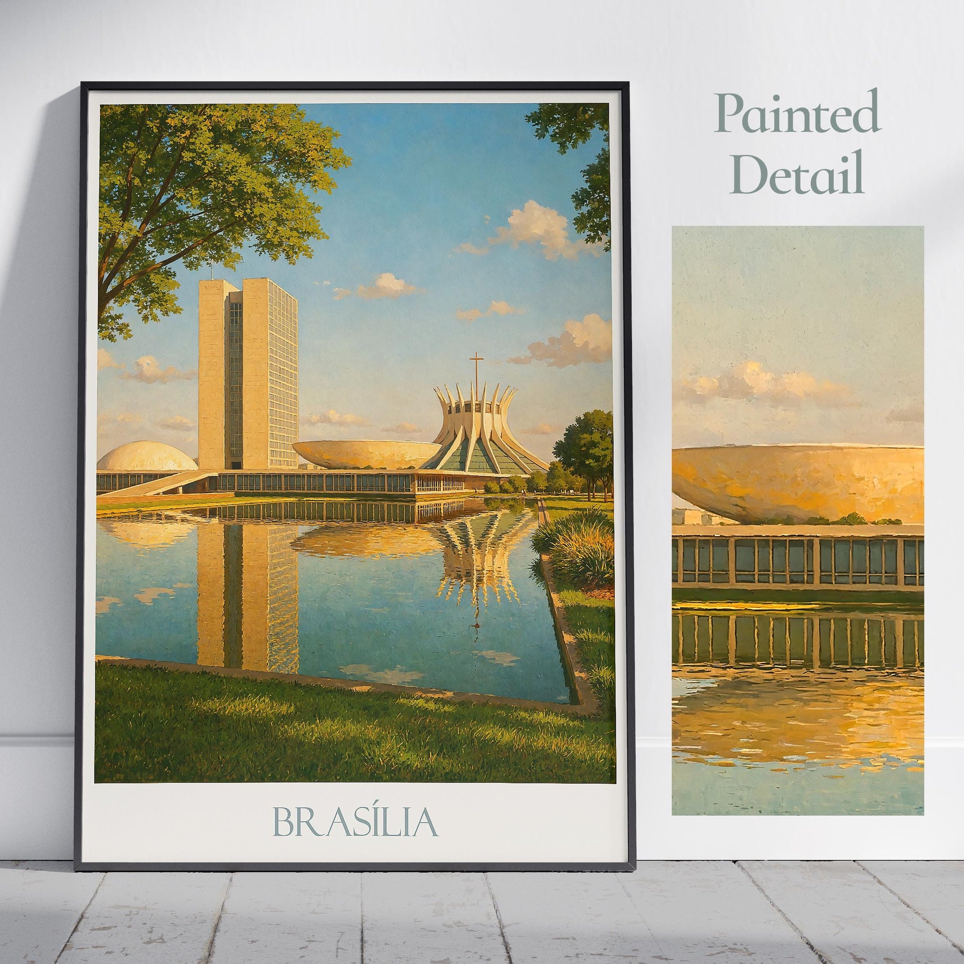 This wide-angle view of Brasília shows the sleek modern structures of the National Congress and the Metropolitan Cathedral reflected in tranquil water. Framed by greenery and golden light, this poster celebrates the harmony of design and nature in Brazil's capital city.