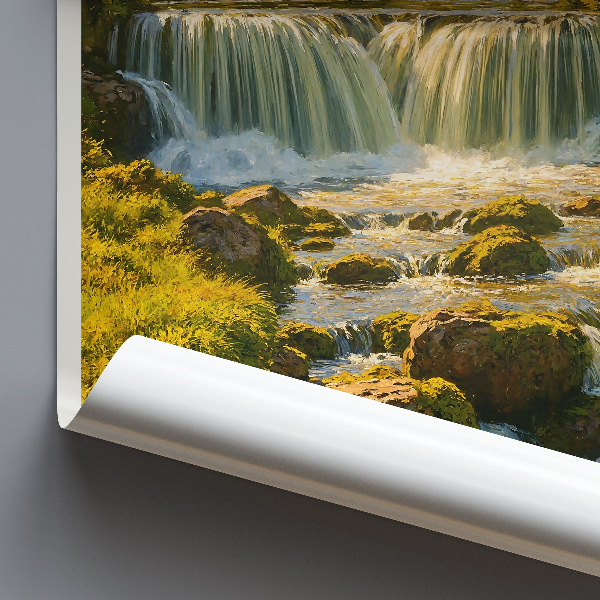 BRECON BEACONS WATERFALL (Wales, UK) - Immerse yourself in the serene beauty of the Brecon Beacons National Park with this stunning travel poster. This captivating art print showcases a majestic, multi-tiered waterfall cascading through lush, sun-drenched green valleys and rolling hills, characteristic of the Welsh countryside. The vibrant colors and painterly style evoke the tranquil essence of this iconic UK natural landmark.
