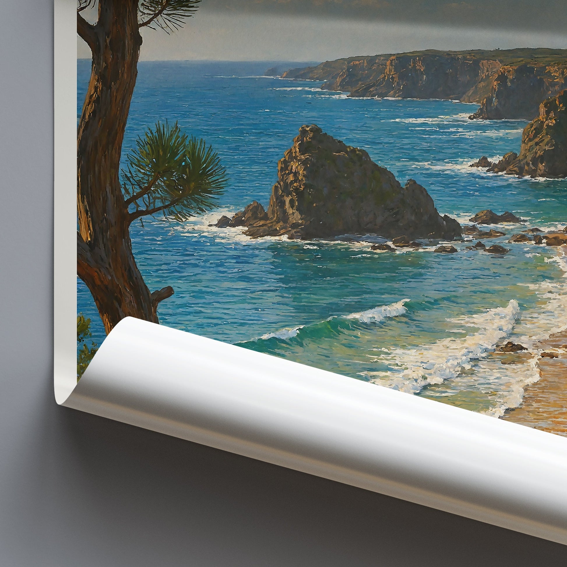 The painterly style of this piece evokes the serene yet powerful spirit of this unique Portuguese landscape, framed by majestic pine trees and lush coastal vegetation. Feel the tranquility of the secluded beach and the invigorating waves crashing against the imposing rock formations, beckoning you to explore.