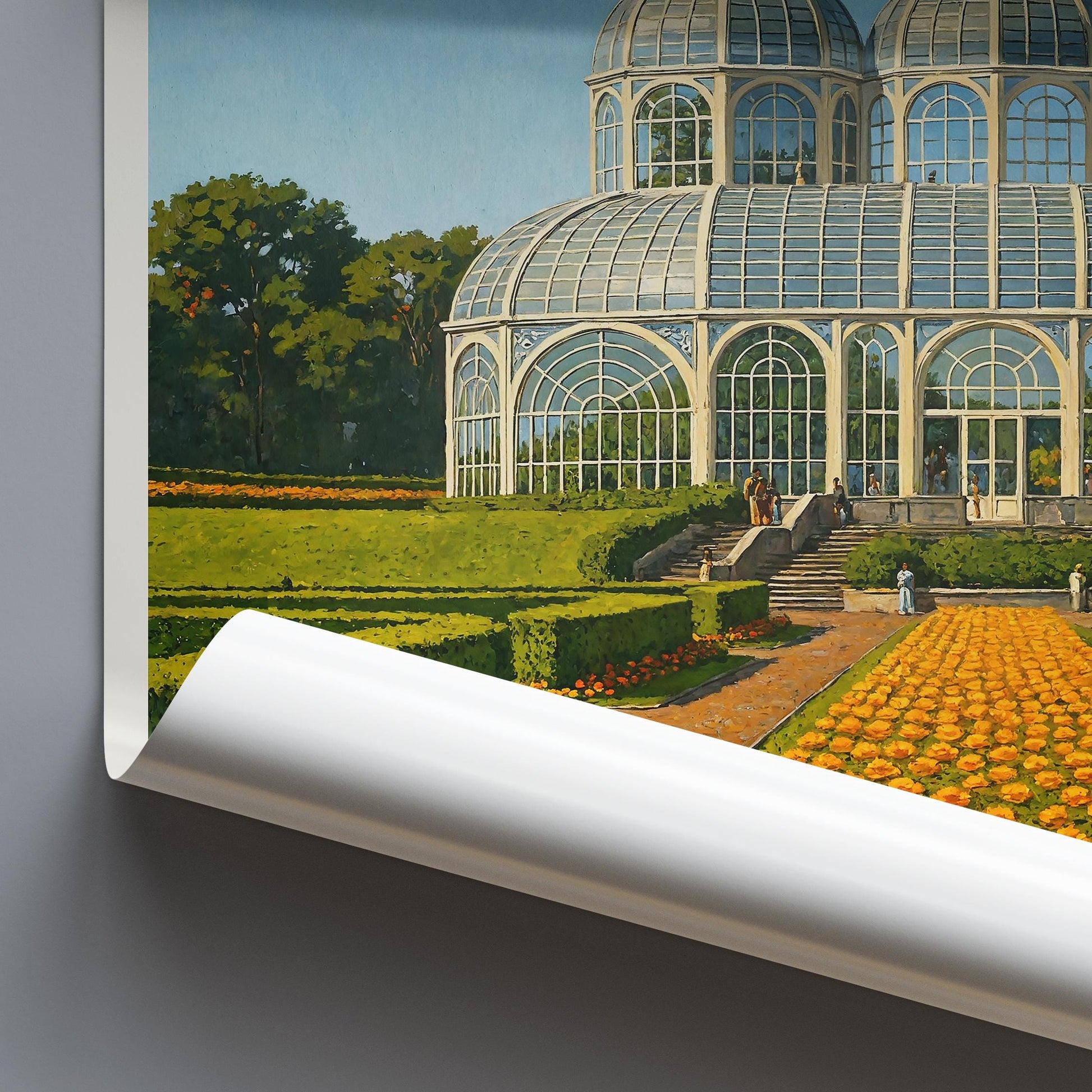 Experience Curitiba's natural beauty with this stunning print of the iconic glass greenhouse in the Jardim Botânico. A radiant carpet of orange flowers stretches toward the ornate domes, perfectly framed by blue sky and symmetrical hedges.