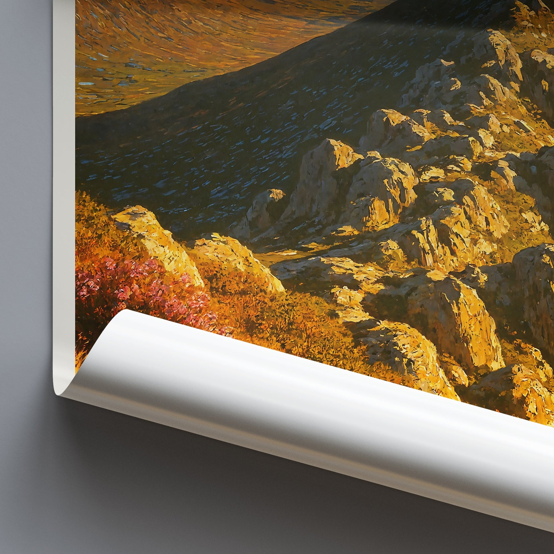 Transport yourself to the majestic Isle of Arran with this breathtaking travel poster featuring Goatfell, the island's iconic peak, bathed in the warm glow of a golden sunrise. This stunning Scottish landscape print beautifully captures the rugged beauty of the mountains meeting the sea, with vibrant hues of gold and green, and hints of purple heather in the foreground.