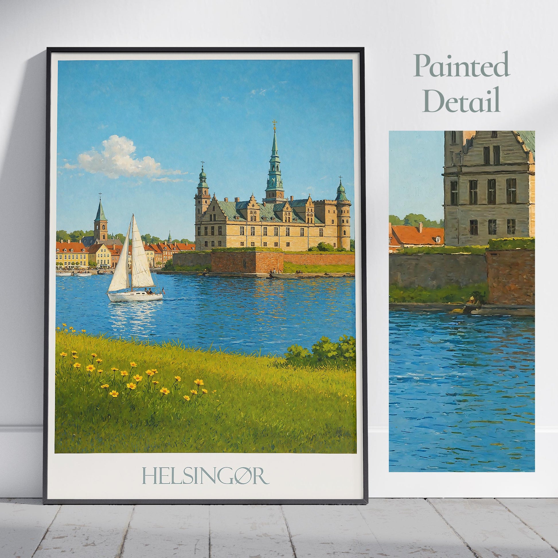 Helsingor Travel Poster, Denmark - Framed Painted Wall Art Print, Personalized Home Decor Gift | Scandinavian Cityscape Vacation Souvenir