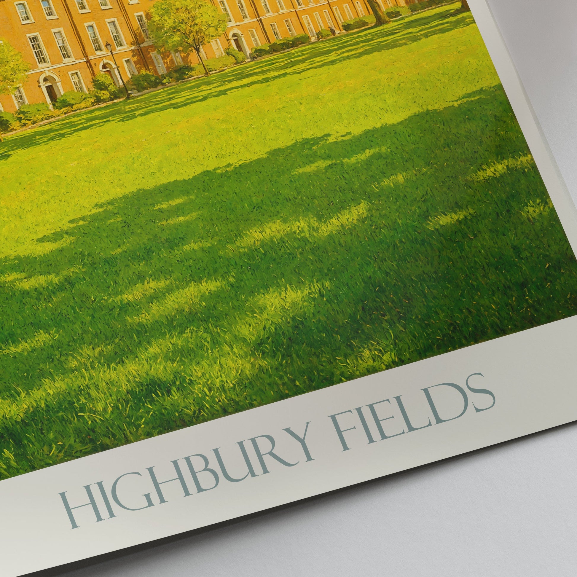 Bring the serene beauty of London's iconic Highbury Fields into your home with this stunning travel poster. This captivating art print perfectly captures a vibrant springtime scene, featuring the lush green common bathed in sunlight, framed by magnificent mature trees with their fresh, golden-green foliage. In the background, the elegant Georgian terraced houses of Islington add a touch of classic British architecture and urban tranquility.