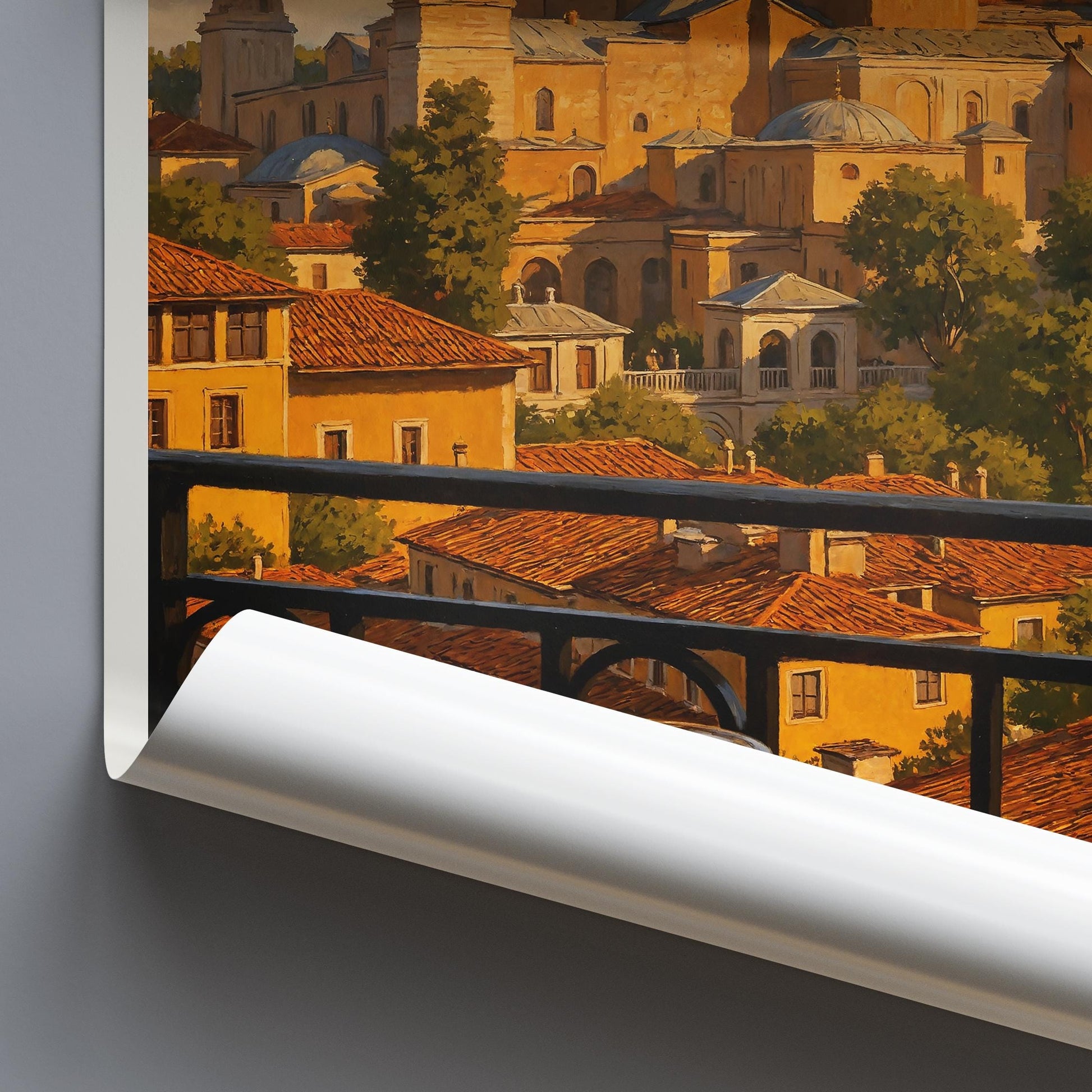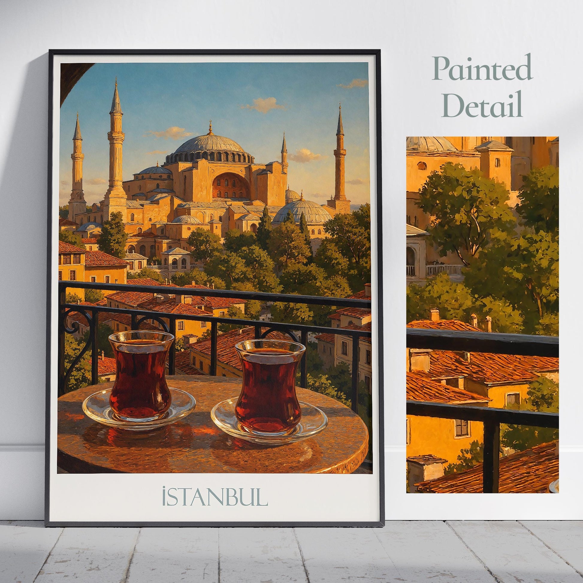 Relish a moment of tranquility overlooking Istanbul's Hagia Sophia (Ayasofya) in this beautifully atmospheric travel poster. Two traditional Turkish tea glasses rest invitingly on a balcony, offering a stunning view of the city's iconic landmark bathed in warm sunlight. Ideal wall art for lovers of Turkish culture, cozy scenes, and historic views.