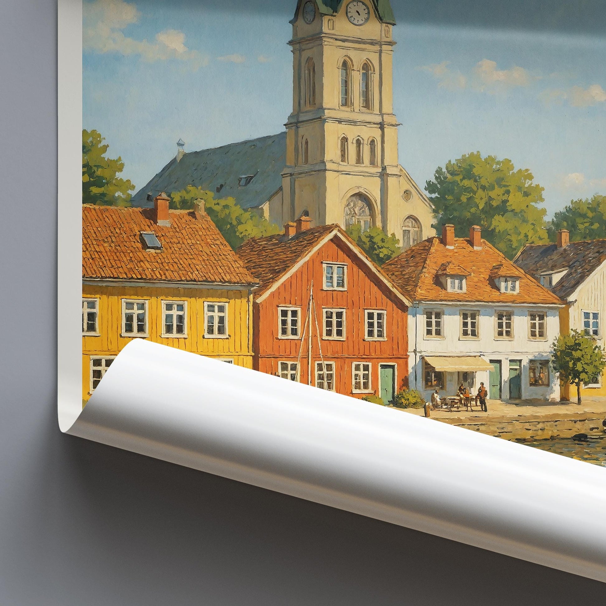 Keywords: Kristiansand Norway poster, Norwegian coastal town art, Kristiansand Cathedral print, Southern Norway travel decor, Scandinavian seaside artwork, Kristiansand harbor wall art.