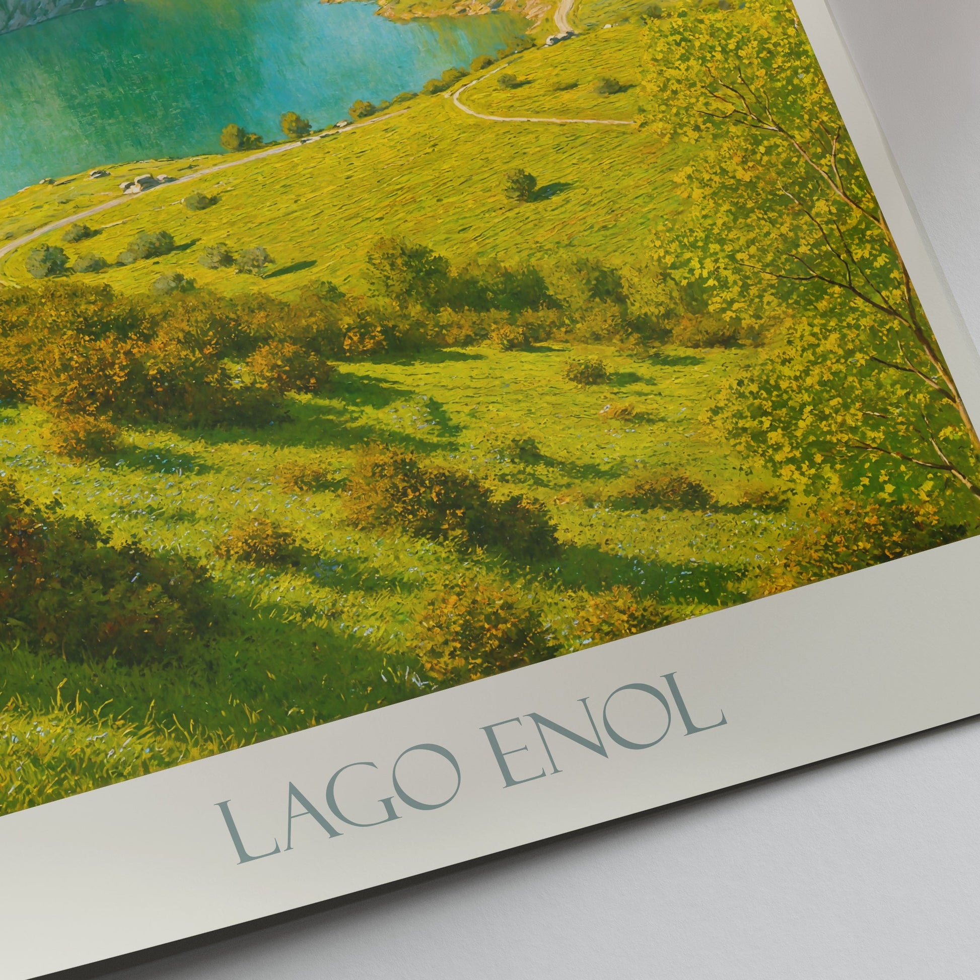 LAKE ENOL (Asturias, Spain) - Discover the breathtaking beauty of Lago Enol with this stunning travel poster. Nestled in the heart of the majestic Picos de Europa National Park in Asturias, Spain, this captivating art print perfectly captures the serene turquoise waters of Lake Enol, surrounded by verdant mountains and lush green meadows. The picturesque winding roads invite you to explore this idyllic natural paradise. This vibrant, painterly print brings the tranquility and grandeur of the Asturian landscape directly into your home. Perfect for nature lovers, travel enthusiasts, or as a thoughtful gift, our Lake Enol poster is a timeless piece of wall art that evokes adventure and peace. Adorn your space with this unique Spanish landscape art and let the serene beauty of Asturias inspire you daily.