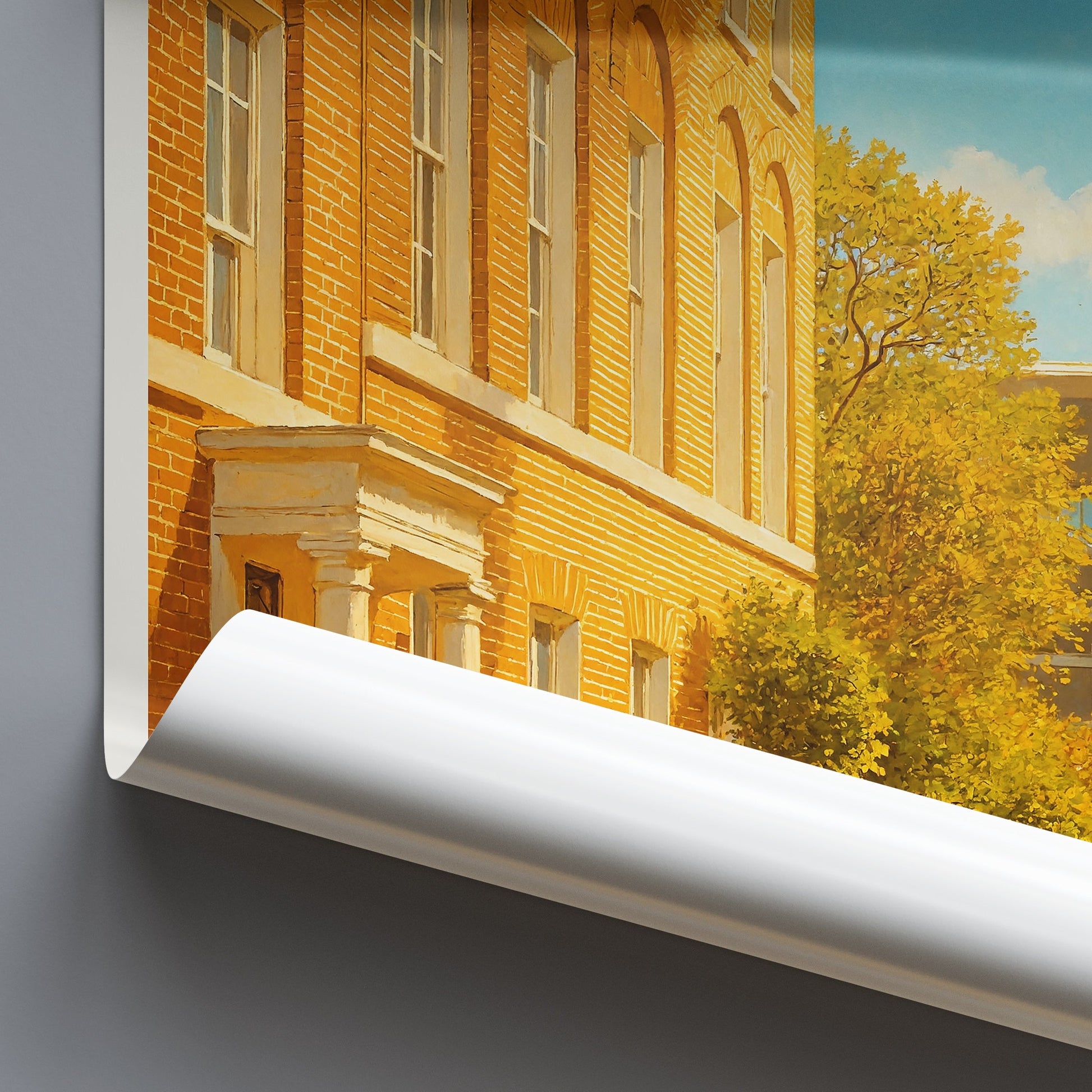 Immerse yourself in the vibrant spirit of North London with this stunning travel poster, capturing the iconic view of Emirates Stadium from the charming Highbury neighborhood. This vintage-style art print beautifully depicts the autumnal glow over classic London architecture and the majestic home of Arsenal Football Club, complete with the famous cannon crest.