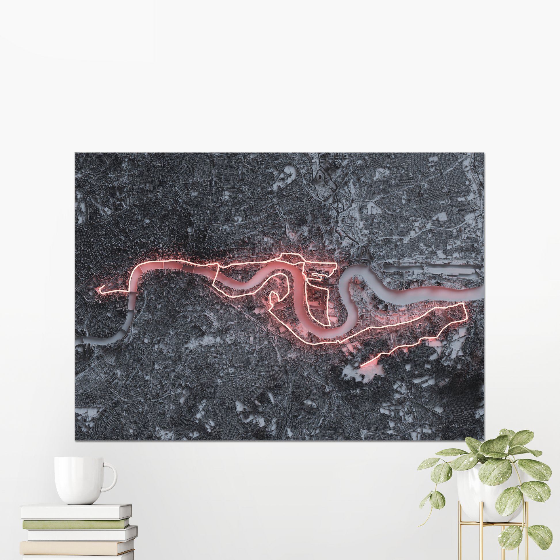 This is a print showing the 26 mile route of the London Marathon across a shaded relief of London, stretching from the Docklands and the O2 to Embankment and the Mall.