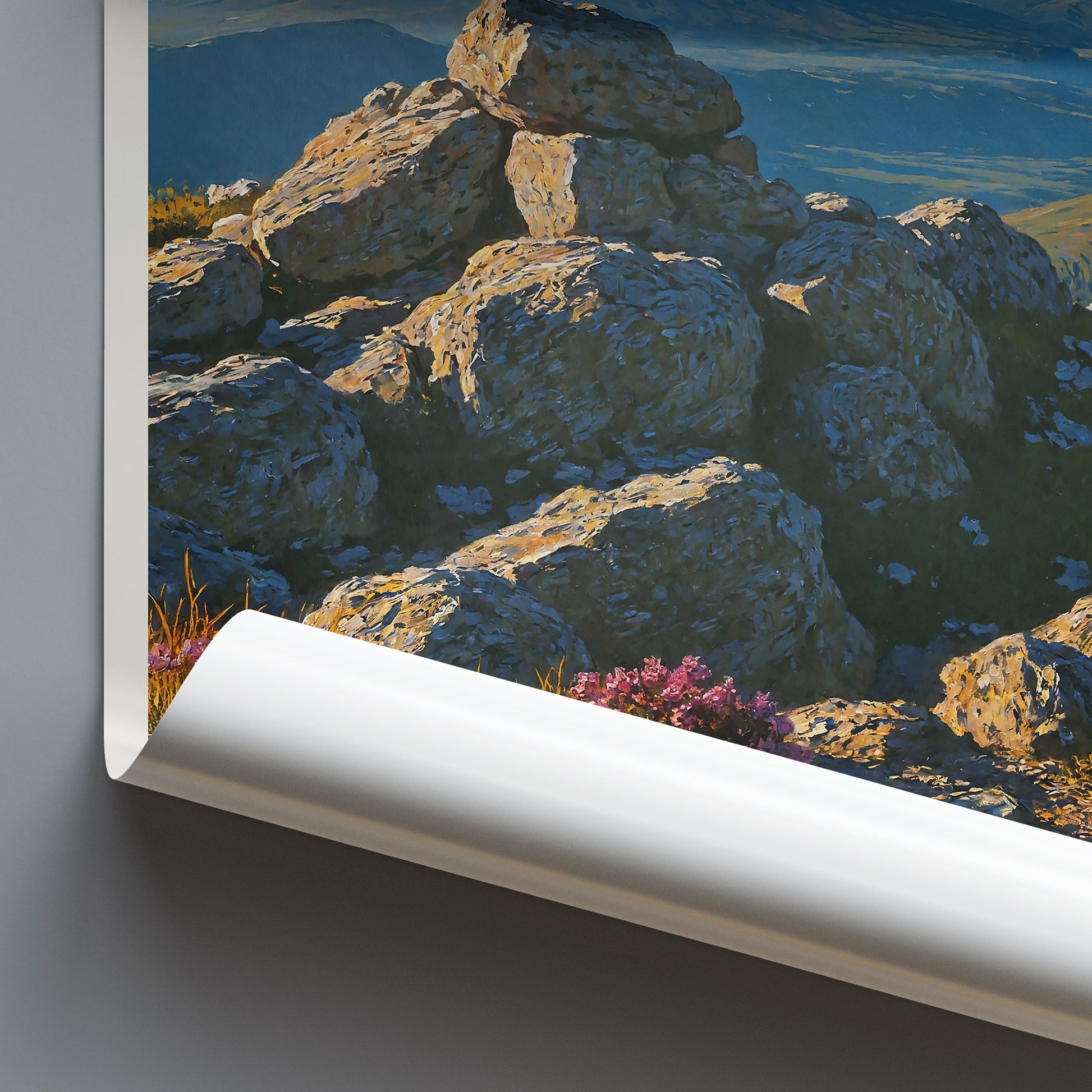Bring the majestic beauty of the Scottish Southern Uplands into your home with this stunning travel poster showcasing the breathtaking panorama from Merrick Summit, the highest point in the Galloway Hills. This exquisite art print captures the dramatic rocky foreground adorned with vibrant pink mountain flowers, contrasting beautifully with the serene blue skies and the vast, rolling green valleys stretching to distant lochs.