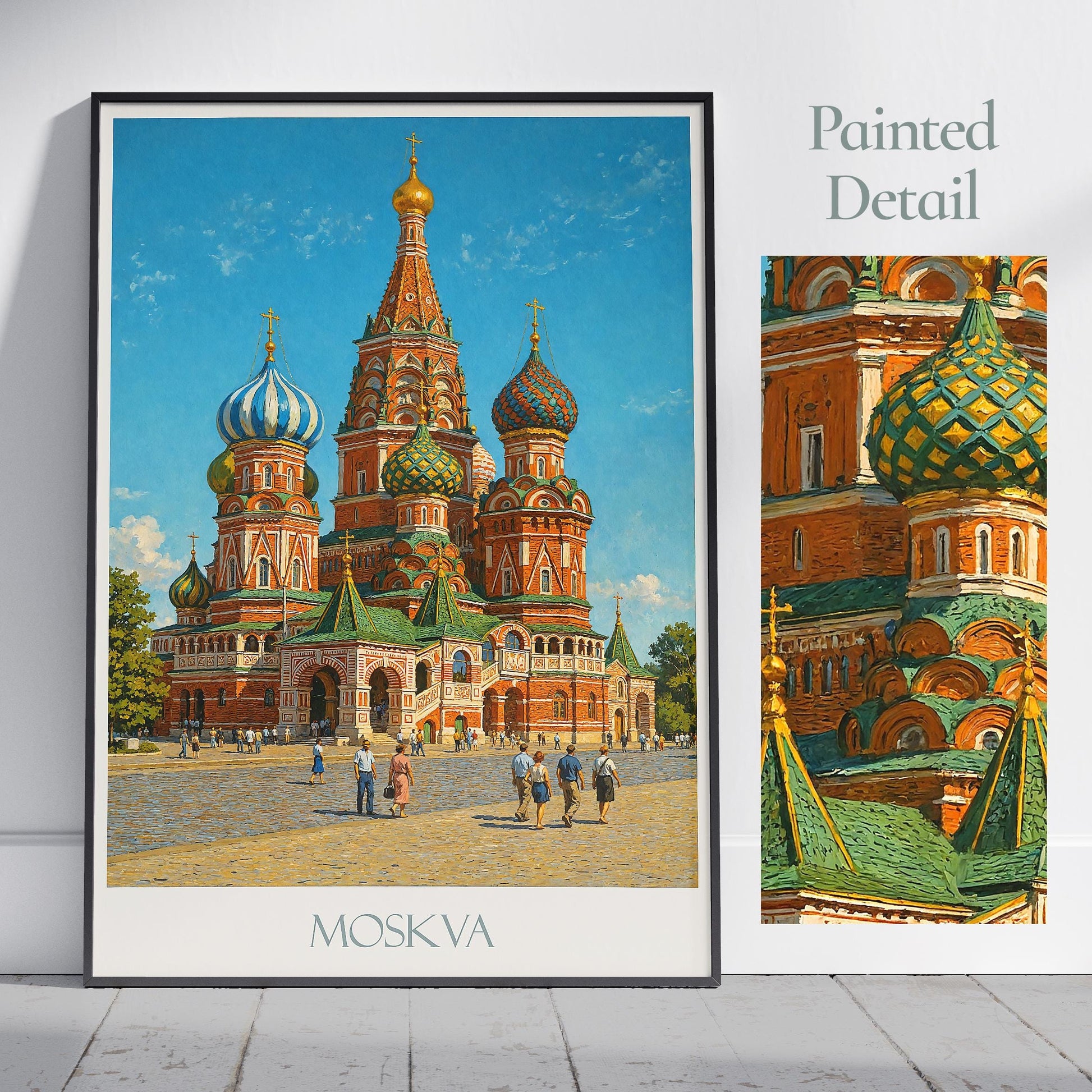 Marvel at the majestic Saint Basil's Cathedral in Moskva (Moscow), Russia, with this vibrant poster capturing its colorful onion domes and intricate details against a bold blue sky. A global icon of Russian architecture, this view of Red Square adds color, culture, and history to any space.