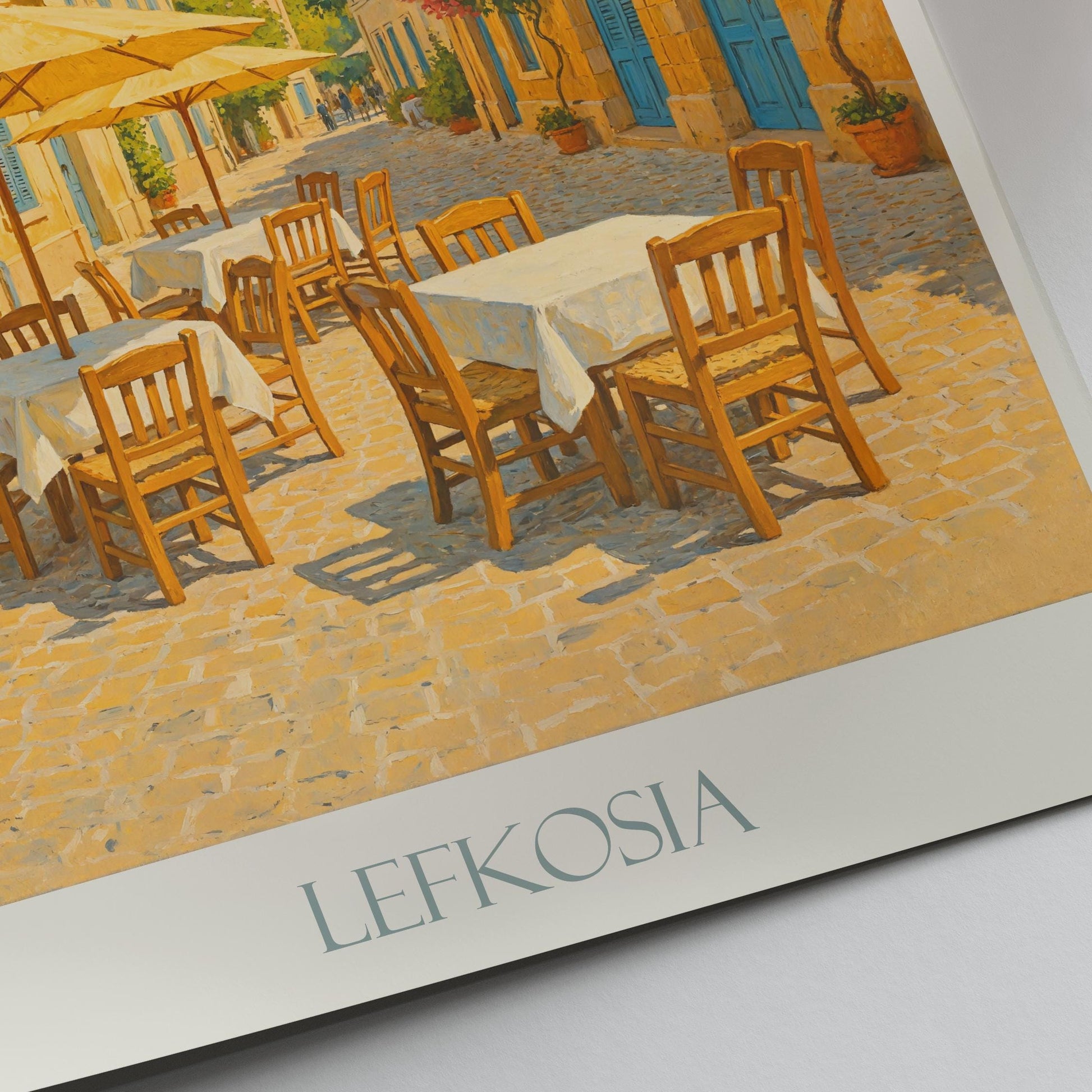 Feel the warmth of Nicosia's charming streets in this sunny poster showing café tables, flowered facades, and the twin minarets of the Selimiye Mosque. A celebration of Cypriot hospitality, Ottoman architecture, and the golden glow of old-town Nicosia.
