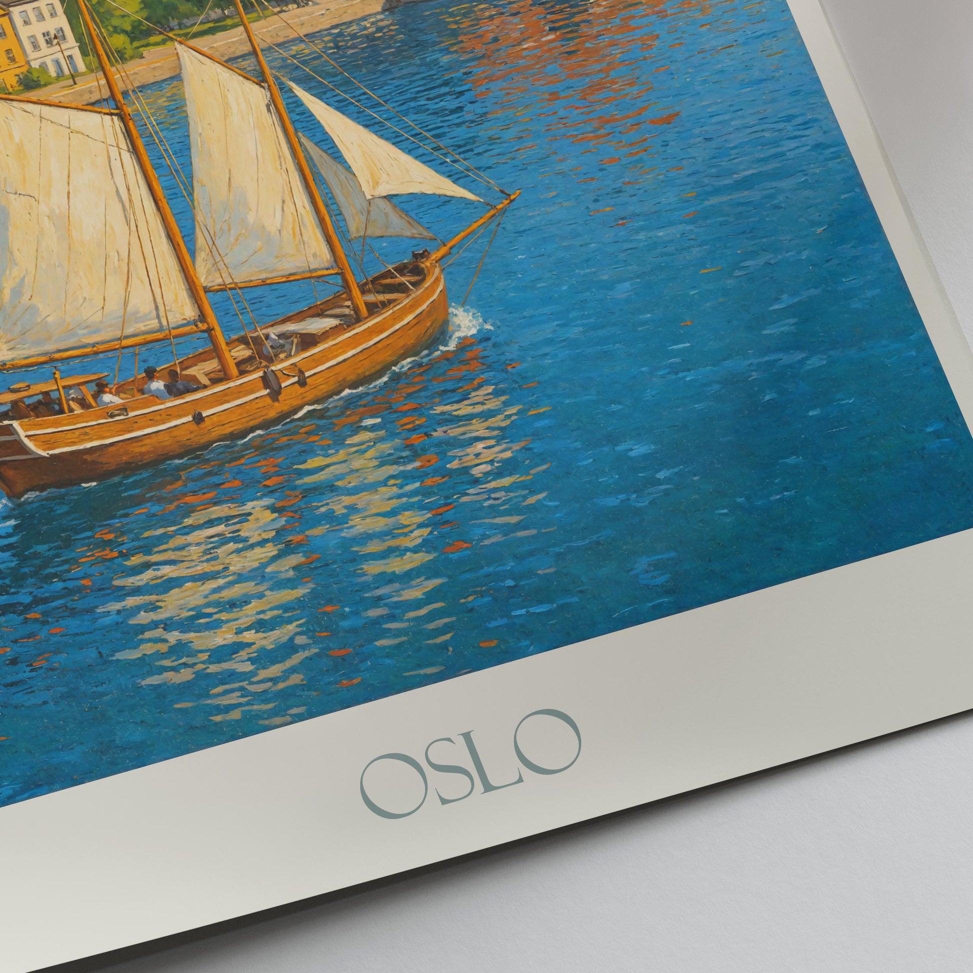 Celebrate the colorful beauty of Oslo, Norway with this vibrant travel poster featuring the historic Akershus Fortress (Akershus Festning) and the striking red towers of Oslo City Hall (Oslo rådhus). A classic wooden sailboat glides across the shimmering Oslofjord, creating a perfect scene for any Scandinavian decor lover. This Oslo Norway wall art is ideal for bringing a touch of Nordic charm into your space.