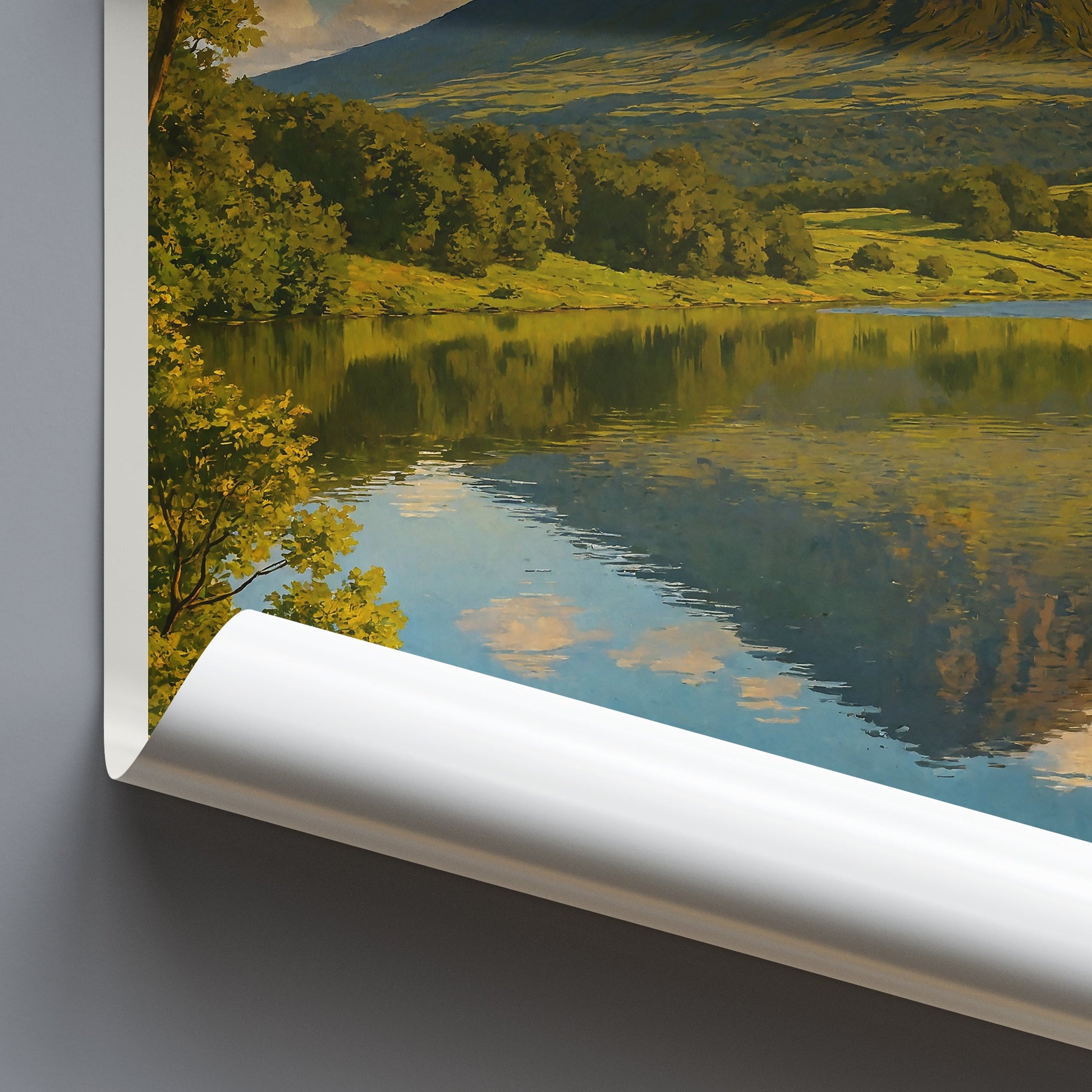 MOUNT PICO (Azores, Portugal) - Monte Pico e Lagoa, Pico Island. Immerse yourself in the breathtaking beauty of the Azores with this stunning travel poster featuring the majestic Mount Pico (Ponta do Pico), Portugal's highest peak, reflected perfectly in the tranquil waters of a serene caldera lake. This captivating art print transports you to the lush volcanic landscapes of Pico Island, framed by vibrant green trees and a serene blue sky. Capturing the island's unique charm and dramatic natural beauty, this Monte Pico poster is a perfect piece of Portuguese wall art for anyone who cherishes travel, nature, and the serene power of volcanic landscapes. Bring the magic of the Azores into your home or gift it to a fellow adventurer.