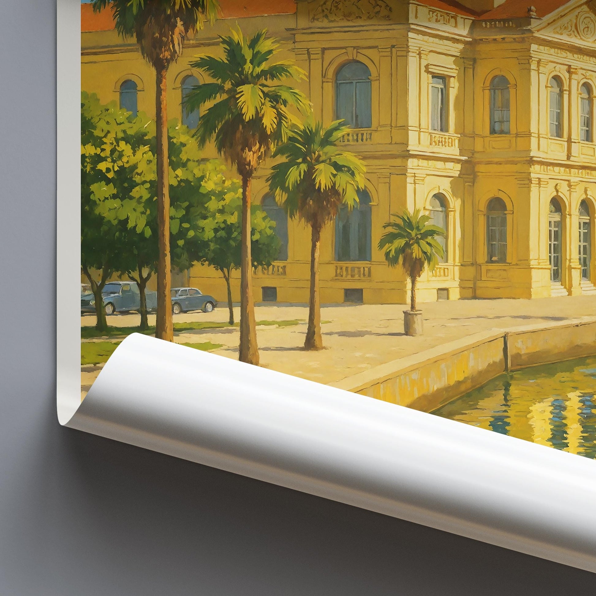 This elegant travel poster of Porto Alegre highlights the domed beauty of Palácio do Comércio and the surrounding colonial-era architecture. Palm trees and reflections in the calm canal add tropical charm to this golden-hued tribute to one of Brazil's most cultured cities.