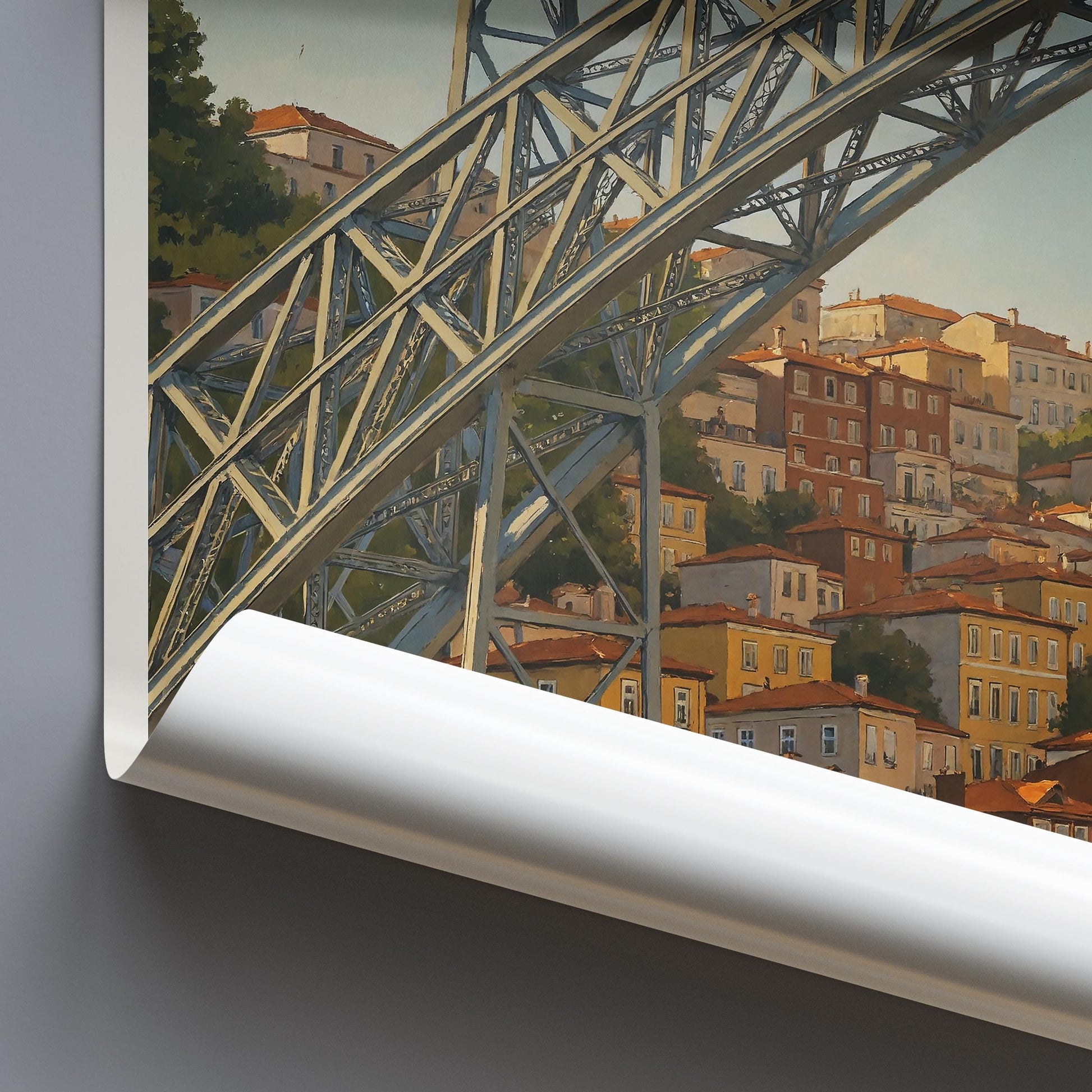 Admire the iconic Dom Luís I Bridge (Ponte Dom Luís I) in this dramatic travel poster featuring Porto's picturesque hillside homes. This beautifully detailed artwork highlights the bridge's impressive ironwork spanning the Douro River, creating an iconic image of this beloved Portuguese city. Perfect for enthusiasts of historic architecture, Portuguese landmarks, and cityscape art.