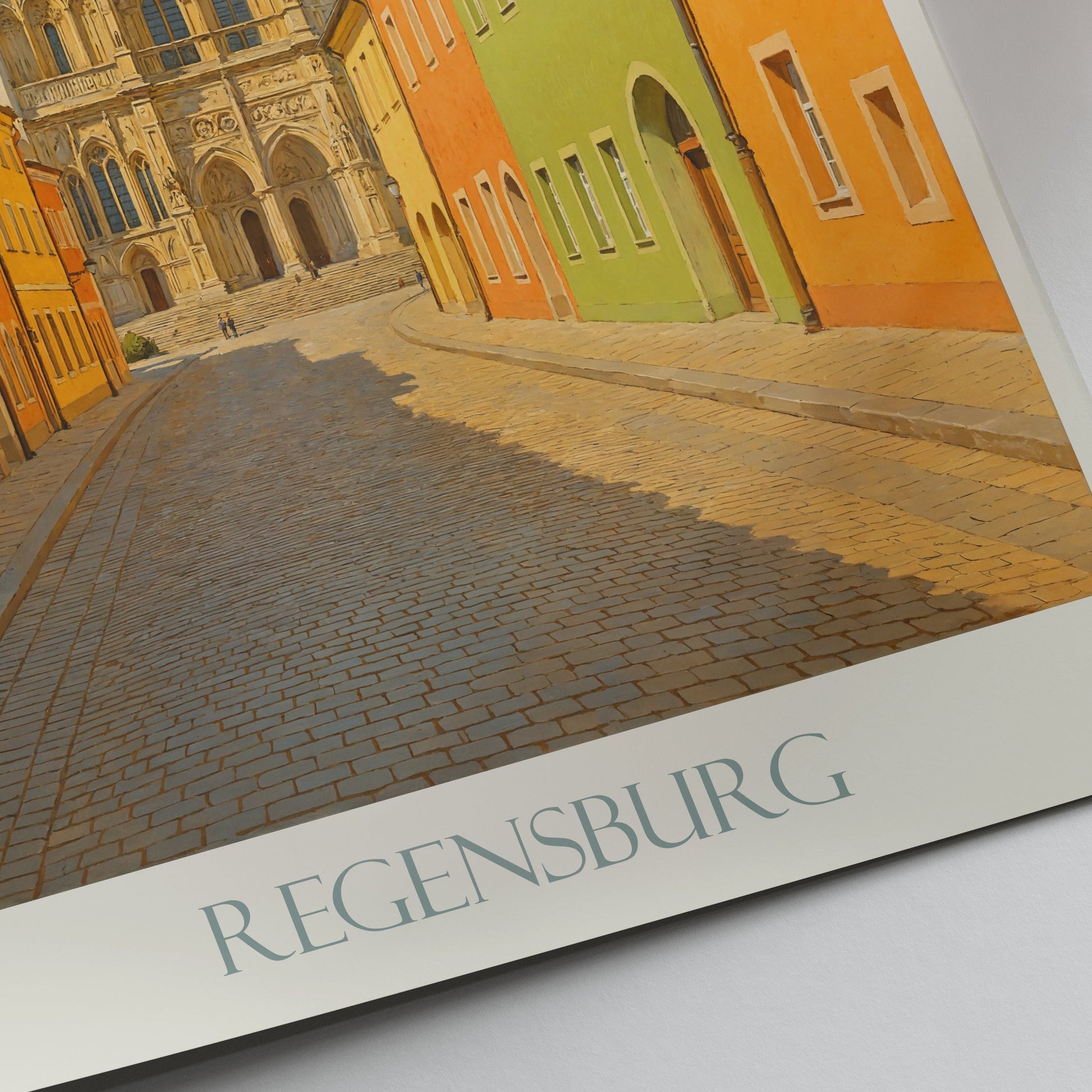 Immerse yourself in the captivating beauty of Regensburg, Germany, with this stunning travel poster. Featuring the majestic Regensburg Cathedral (Dom St. Peter) towering over a charming cobblestone street, flanked by vibrant, colorful buildings, this art print beautifully captures the essence of this UNESCO World Heritage city.