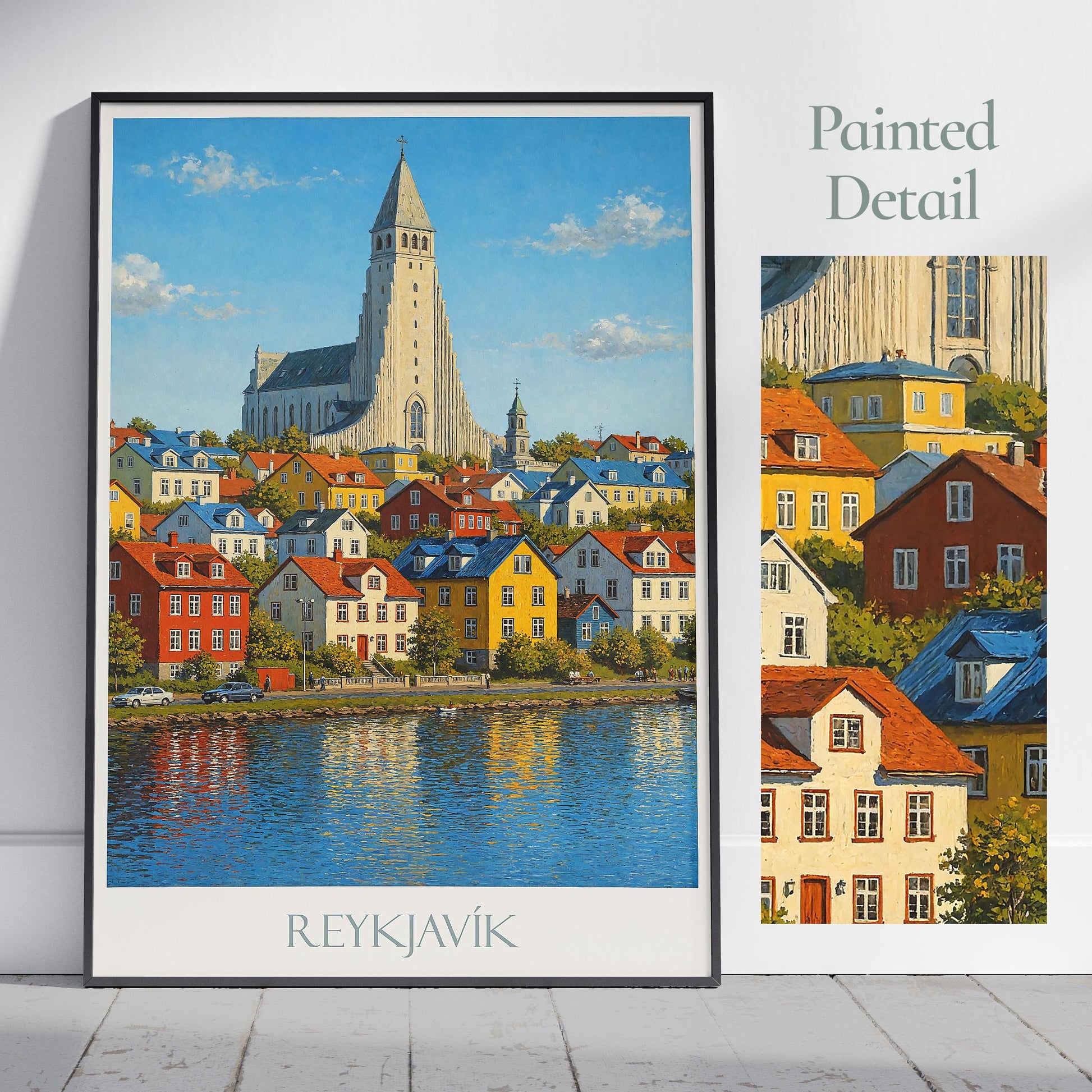 Brighten your space with this vibrant view of Reykjavík, Iceland's colorful capital. Featuring the iconic Hallgrímskirkja church rising above rainbow-painted houses and calm water, this poster captures the playful charm and dramatic minimalism of Icelandic design.