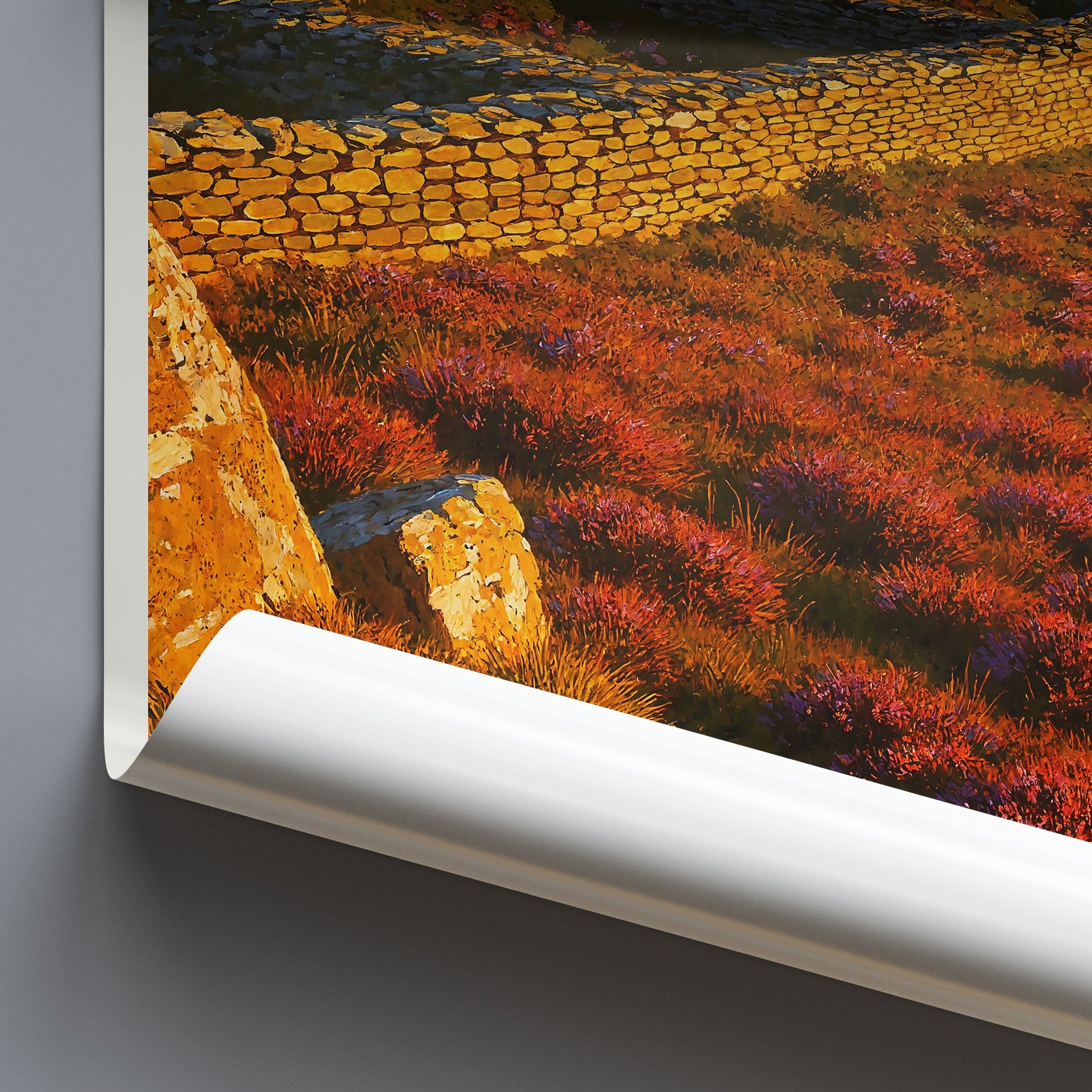 TRE'R CEIRI (Wales) - Discover the breathtaking beauty of Tre'r Ceiri, one of Wales' most impressive Iron Age hillforts, nestled in the dramatic landscape of the Llŷn Peninsula. This stunning travel poster captures a golden sunrise illuminating the ancient drystone walls and vibrant, heather-covered slopes, with sweeping views of the coastline and distant mountains. Perfect for history buffs, Welsh heritage enthusiasts, or anyone who cherishes the rugged beauty of the British Isles. This unique art print brings the timeless allure of Wales directly to your home, offering a glimpse into a captivating past. An ideal gift for travel lovers or a distinctive piece of home decor.