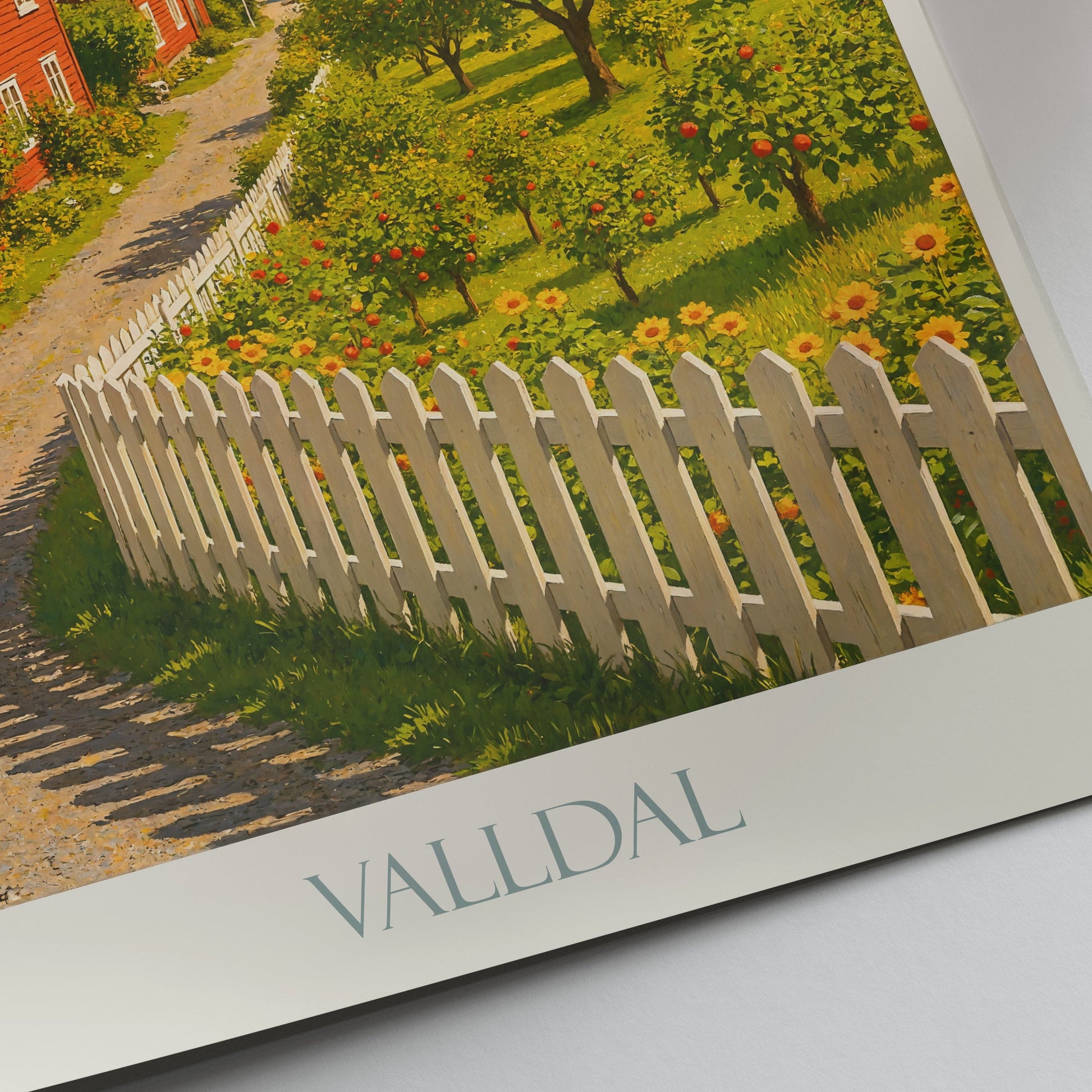 Bring the serene beauty of the Norwegian countryside into your home with this captivating Valldal travel poster. This stunning art print showcases the picturesque village of Valldal nestled against a breathtaking fjord landscape, surrounded by majestic mountains. The scene features charming traditional red houses lining a winding gravel path, adorned with a classic white picket fence and a vibrant orchard bursting with apple trees and cheerful sunflowers. The unique, painterly style of this piece beautifully captures the tranquility and rustic charm of rural Norway in summer. Perfect for lovers of Scandinavian aesthetics, nature enthusiasts, or anyone seeking to add a touch of peaceful, idyllic scenery to their living space. This Valldal Norway print makes an excellent souvenir, a thoughtful housewarming gift, or a beautiful addition to your travel-themed wall art collection.