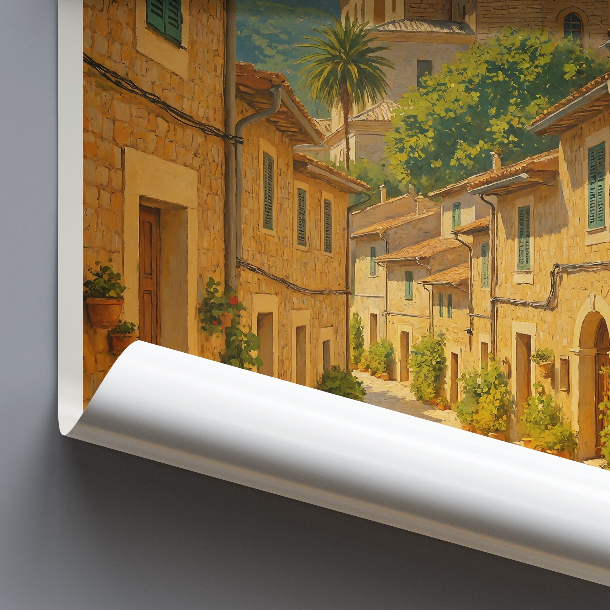 VALLDEMOSSA (Mallorca, Spain) - Immerse yourself in the timeless beauty of Valldemossa with this enchanting travel poster. This art print captures the picturesque essence of the historic village, nestled in the heart of Mallorca's stunning landscape. Wander down a charming cobblestone street, lined with traditional honey-colored stone houses adorned with vibrant green shutters and an abundance of terracotta potted plants.