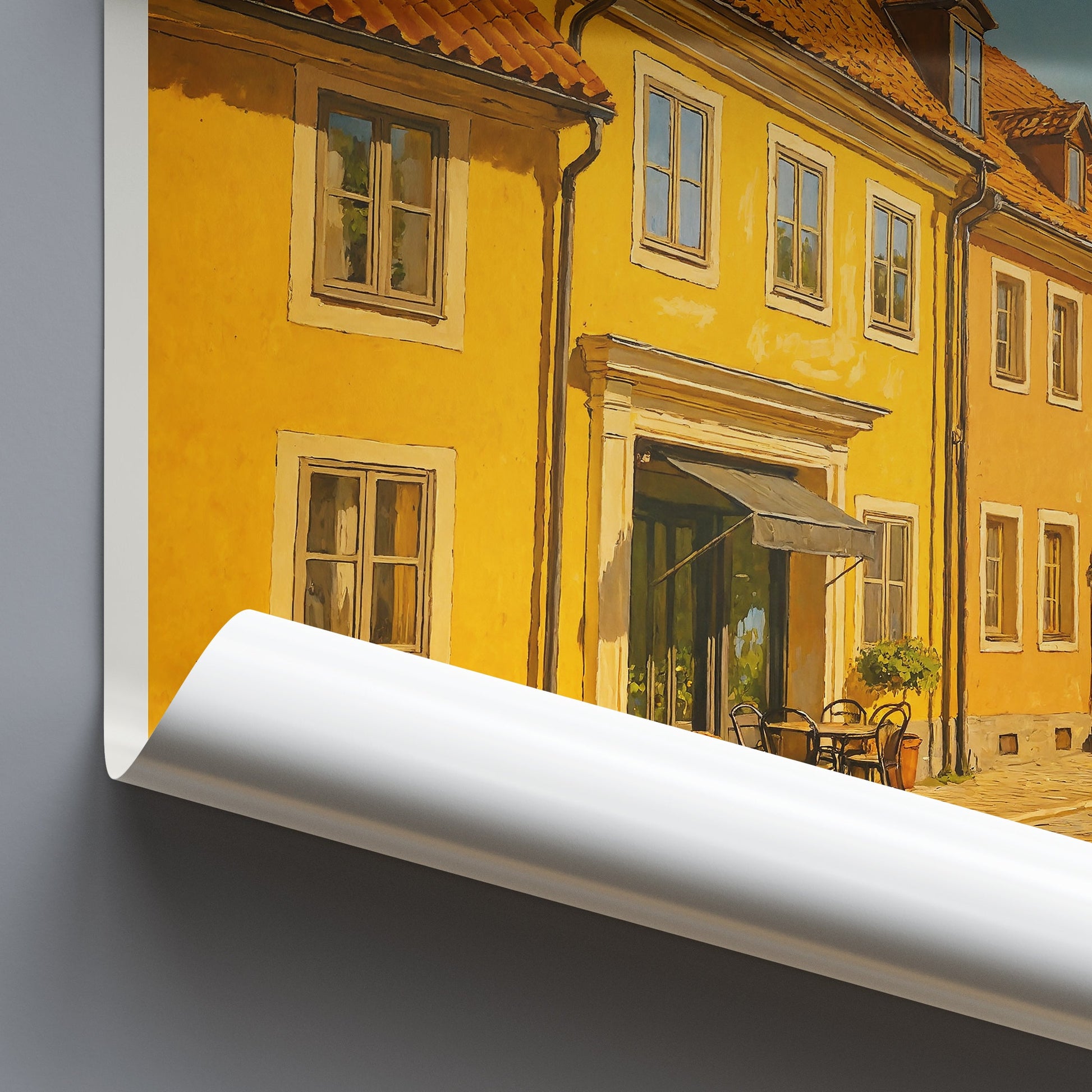 VISBY (Sweden) - Charming Street in the Medieval Town. Immerse yourself in the timeless beauty of Visby, Sweden, with this enchanting travel poster. Capturing the essence of a sun-drenched cobblestone street lined with vibrant yellow buildings and iconic red tile roofs, this artistic print brings the magic of the UNESCO World Heritage site of Visby's medieval Old Town right into your home. The painterly style of this Gotland art print evokes a sense of nostalgic charm, perfect for adding a touch of Scandinavian elegance to any room. Whether you've explored its ancient alleyways or dream of visiting, this Visby poster is an ideal piece of wall art for travel enthusiasts, history lovers, or anyone seeking unique home decor. A wonderful gift for birthdays, anniversaries, or a personalized reminder of an unforgettable trip to the beautiful island of Gotland.